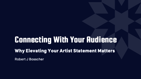 Discussion will include what should be included in a thorough statement, what to avoid, and how to utilize an artist statement to connect with a wide audience. At the end of the day, if we're able to better connect with our audience, then our work has succeeded!